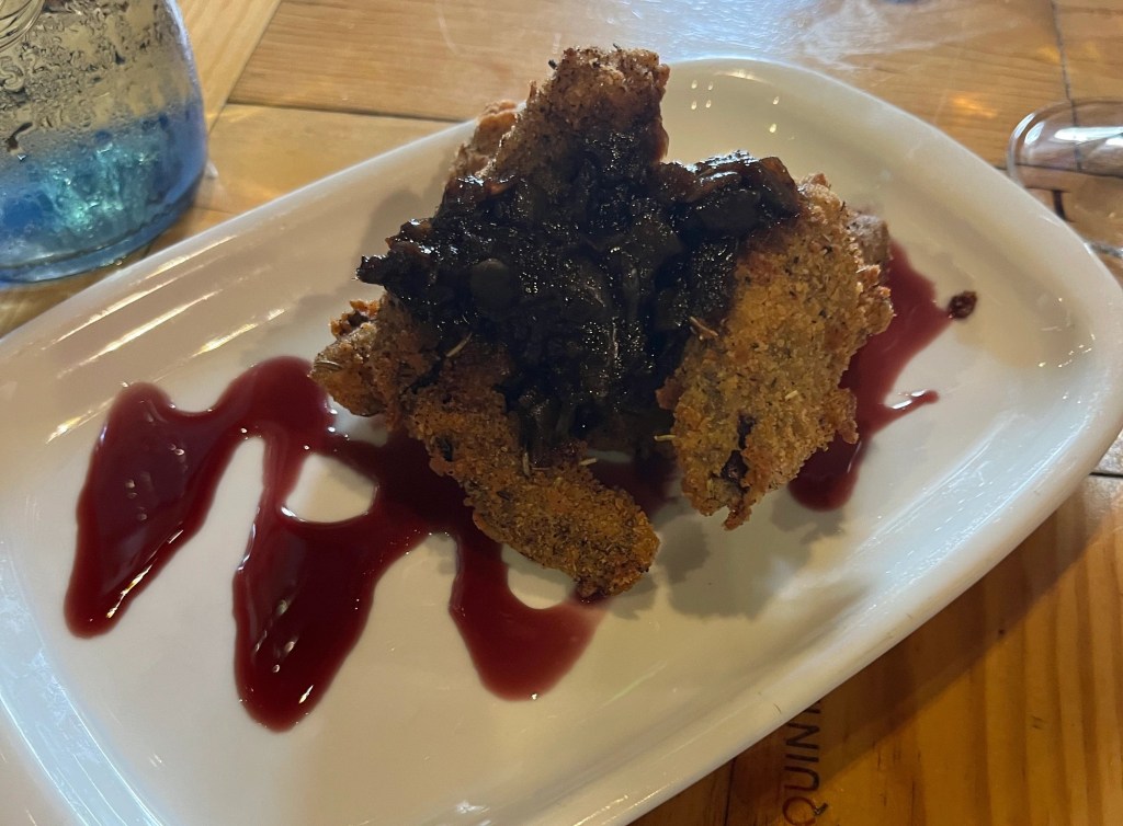 We are eating local during this trip and letting our servers recommend our meals. We chose A Tasca for our first dinner here and let our server choose our meal. He brought us Sautéed Mushrooms with bacon, spinach and cheese, Fried Octopus with plum sauce and Pork Cheeks with bread purée and fries. We shared a bottle of Azorean wine and a piece of pineapple cake for desert. It was fantastic!