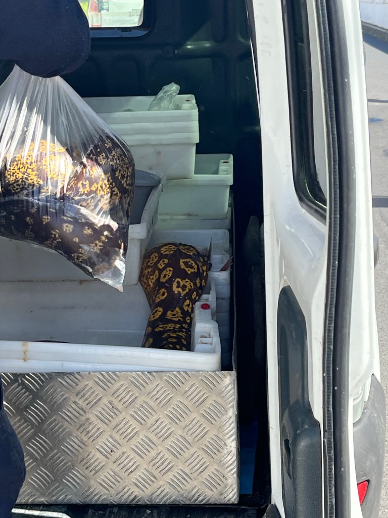 A white van was driving from restaurant to restaurant selling the fish he had just caught. He had a large bicycle horn that he held outside the window and honked constantly so you knew when he was getting near. He stopped near us and I saw he had caught a bunch of eels.